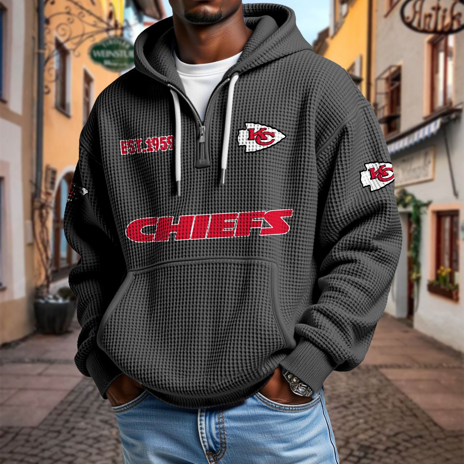 Stay effortlessly stylish and comfortable with this premium waffle-textured hoodie. Designed with a relaxed fit and soft, breathable fabric, it’s perfect for layering or wearing on its own. The half-zip front and adjustable drawstring hood add modern versatility, while the kangaroo pocket keeps your hands warm and essentials close.